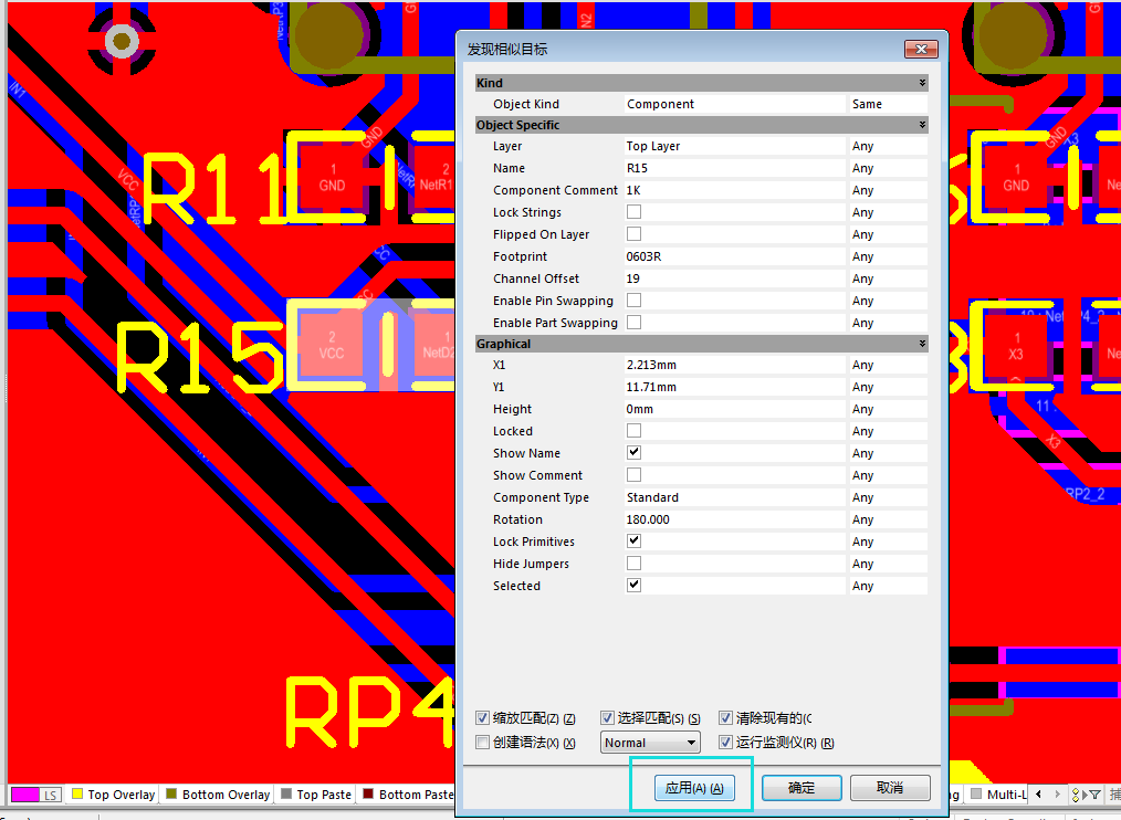 首先點中一個器件,右鍵找到查找相似對象然后直接應(yīng)用,不要改任何設(shè)置。器件就都會選中,然后確定,去掉勾選Show Name字符就消失了,大家可以試試!