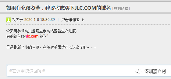 若干年后:XXX同行公司高管,盯著嘉立創(chuàng),在海外購(gòu)買了WWW.SZJLC.COM的域名。當(dāng)客戶要訪問(wèn)深圳嘉立創(chuàng)官網(wǎng)域名:WWW.SZ-JLC,少輸個(gè)“-”時(shí),結(jié)果直接設(shè)置跳轉(zhuǎn)到XXX同行網(wǎng)站,再度來(lái)一個(gè)李鬼與李魁的故事,我方人員在曉明利害關(guān)系私下從xxx同行買下這域名,XXX同行還以此事為自己美化,就像做了壞事,然后賠理道謙了還理直氣壯!