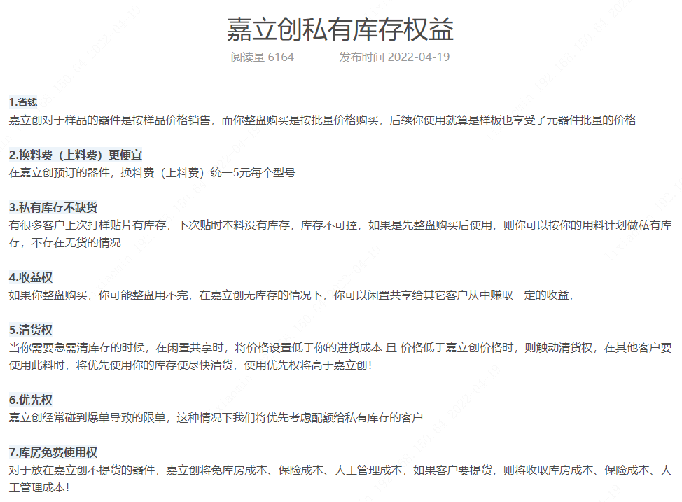 一、客戶通過預(yù)訂的器件,如有多出的器件使用不完可以在嘉立創(chuàng)發(fā)布閑置,不用擔(dān)心器件會(huì)過期。對(duì)于熱門的物料如市場上缺貨,還可以加價(jià)發(fā)布閑置。備貨私有庫存有很多權(quán)益。權(quán)益如下: