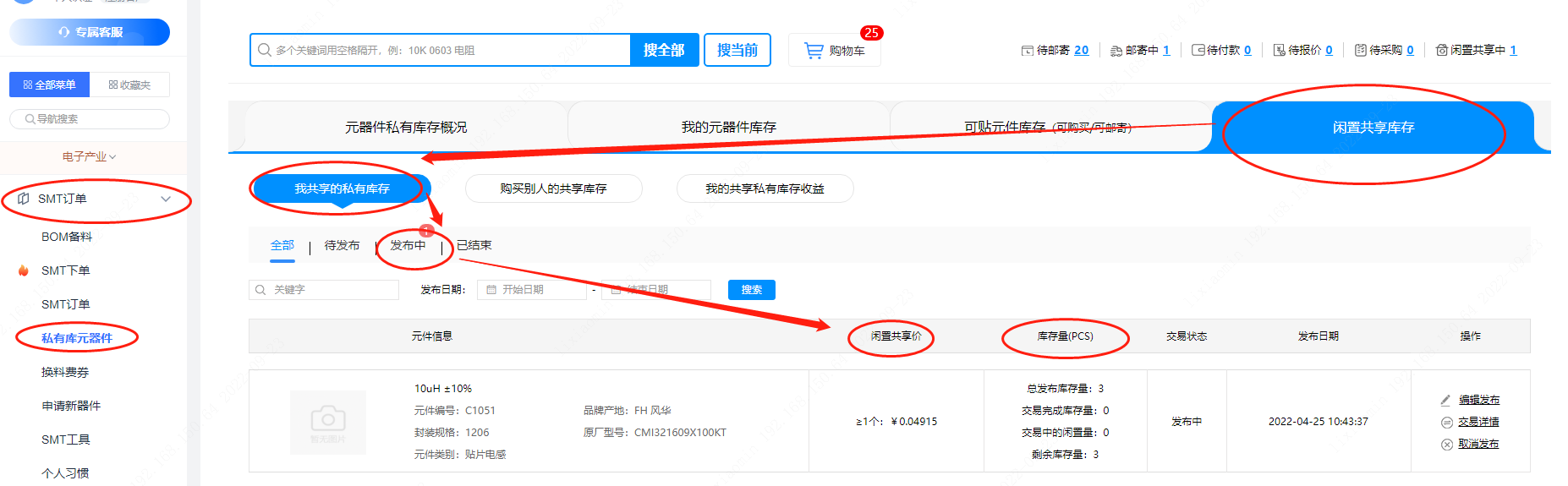 第三步:若您想查看所發(fā)布的共享庫存器件,點(diǎn)擊【私有庫元器件】--【閑置共享庫存】--【我共享的私有庫存】--【發(fā)布中】即可,可以看到庫存量、閑置共享價(jià)等等信息。