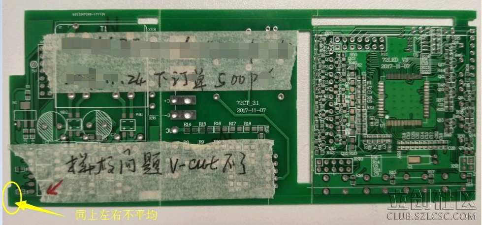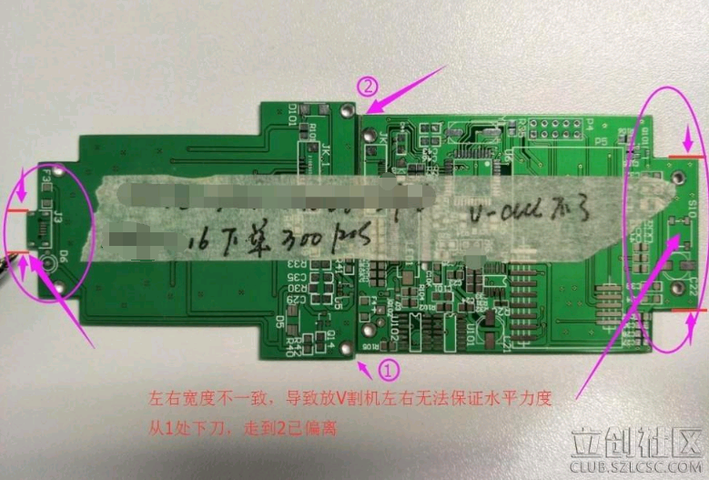 在看看另一種拼板,因左右無法保證水平,造成的V割偏位。