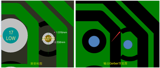 把相連的兩個(gè)焊盤點(diǎn)輸出Gerber同時(shí)放大查看……