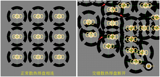 對(duì)于這種內(nèi)層“散熱盤與隔離帶重疊”引起斷開的,在軟件設(shè)計(jì)上是沒有問題的,軟件網(wǎng)絡(luò)分析檢測(cè)也會(huì)認(rèn)為是相連的,但實(shí)際上是“假連接真斷開”,類似的還有“散熱盤重疊”等會(huì)引起線接不良。