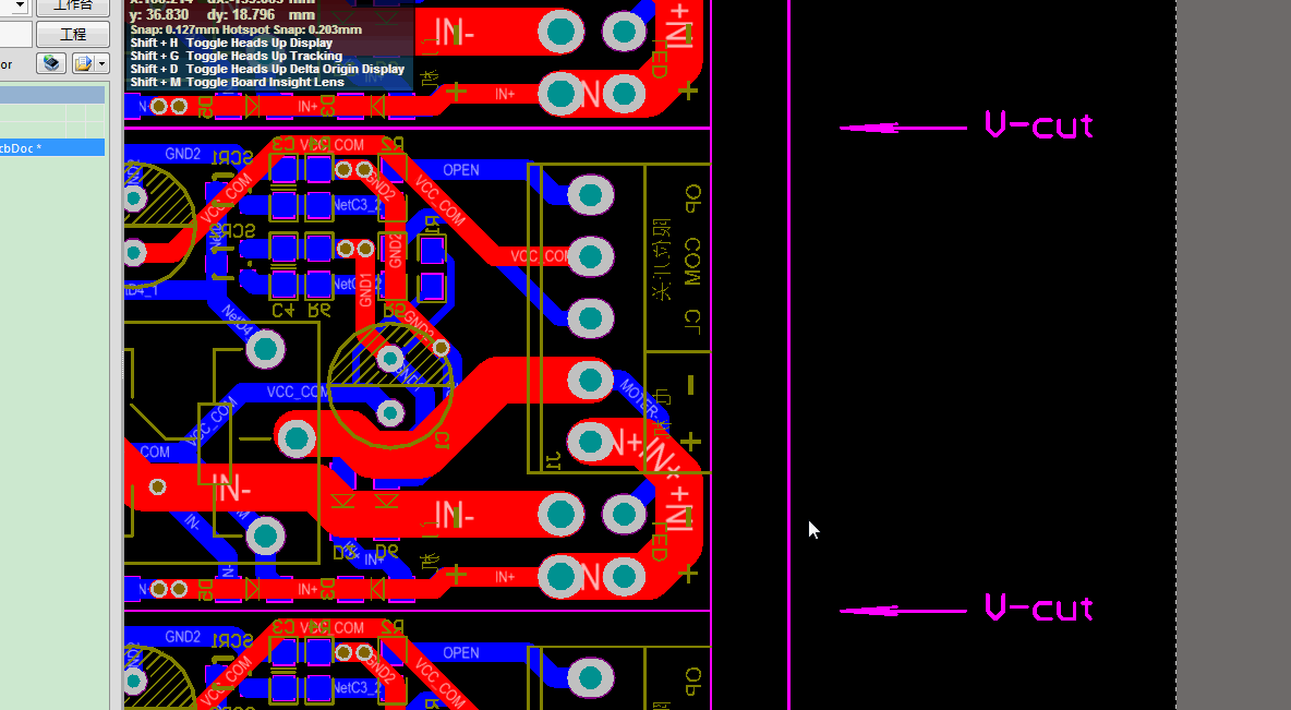 選擇“keep-out”層,進(jìn)行繪制。在工藝邊上加上“定位孔”及“Mark點”,最后用任意一層如“Overlay”層或“keep-out”層,標(biāo)注V槽。到此,整個拼板過程完成,如下圖所示。
