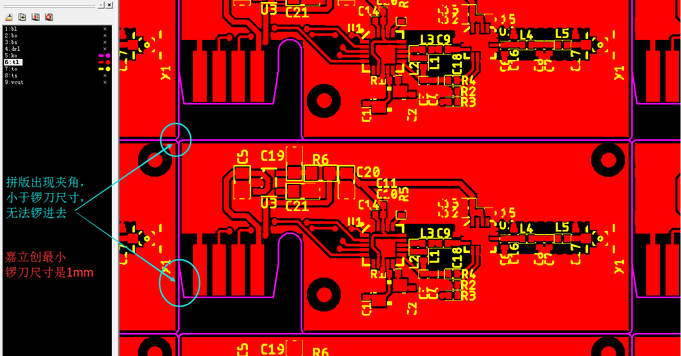 為了提高生產(chǎn)效率,采用連片拼板,但不規(guī)則外形常見錯(cuò)誤,像有些小角度,斜角外形拼版出現(xiàn)夾角,小于鑼刀尺寸它是無法鑼進(jìn)去。(槽刀最小尺寸1.0mm)http://thbsqx.cn/portal/server_guide_4110.html