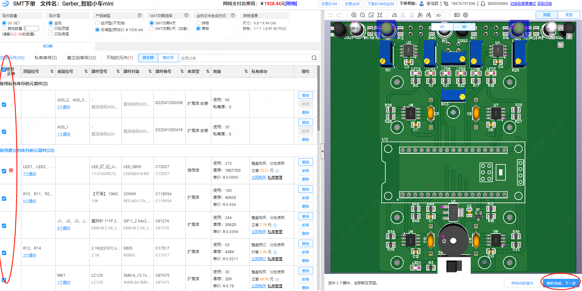 第四步:確定好需要郵寄的器件型號,勾選【核對正確】,要確保所有都勾上,匹配完成后,然后點(diǎn)【備料完成,下一步】
