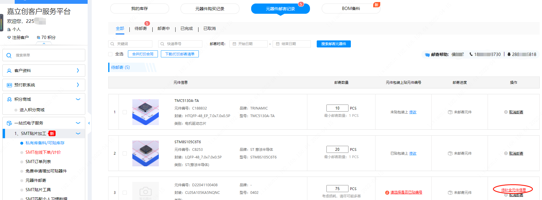 若您在郵寄元器件后,想要查詢器件是否入庫、變更/增加快遞號,郵寄庫存查詢、郵寄器件庫存清單、郵寄合同等信息。