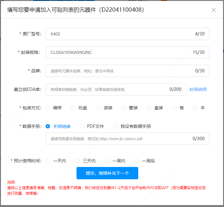 點(diǎn)擊【待補(bǔ)全元件信息】,會彈出“填寫您要申請加入可貼列表的元器件”的頁面,需要客戶提供元器件型號的尺寸信息。