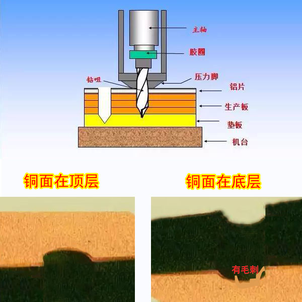 是鉆頭最先鉆到銅面,由于底下是基板墊底,可以把銅面鉆的很干凈。而如果銅面朝下鉆孔,就會(huì)產(chǎn)生大量毛刺披峰的。