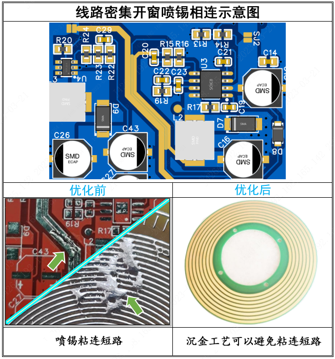 設(shè)計優(yōu)化:密集線條開窗噴錫易粘連建議做沉金