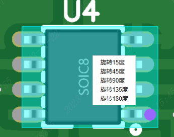 步驟1: 鼠標(biāo)點(diǎn)擊需要旋轉(zhuǎn)的器件,單擊鼠標(biāo)右鍵。 會(huì)彈出旋轉(zhuǎn)的度數(shù),選擇需要旋轉(zhuǎn)的度數(shù)就可以了,亦或是點(diǎn)擊需要旋轉(zhuǎn)的器件按鍵盤空格鍵也可以旋轉(zhuǎn)器件的方向 ,如需要取消選中,鼠標(biāo)點(diǎn)擊空白處即可 例如下圖: