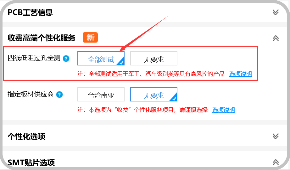 嘉立創(chuàng)在提供了四線低批量性管控的同時(shí),也提供了客戶的全部進(jìn)行低阻測(cè)試的高端選項(xiàng),