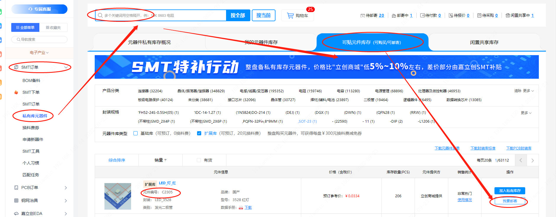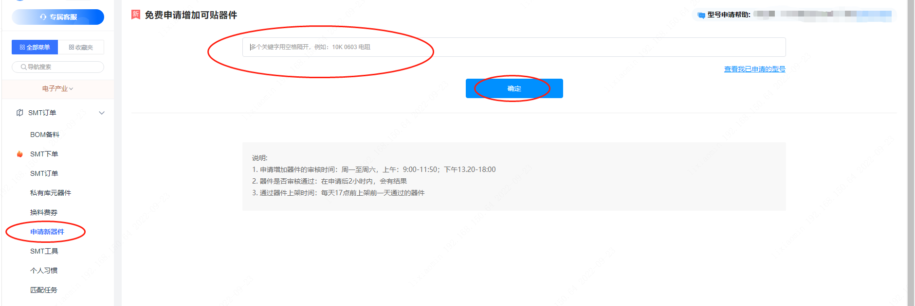 答:必須先申請(qǐng)把這個(gè)器件添加到可貼元器件列表中。嘉立創(chuàng)審核通過后,并顯示“已上架”后就可以寄料,操作如下: