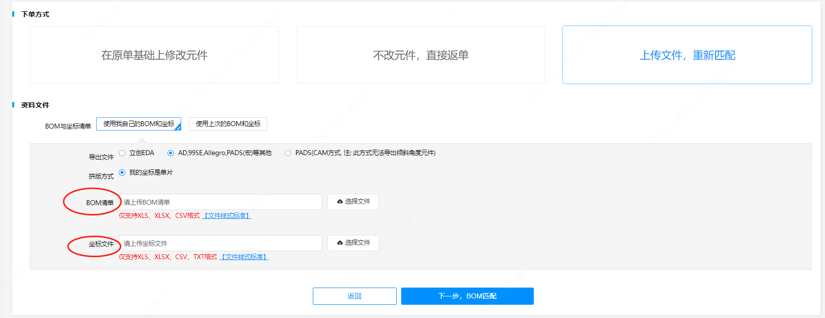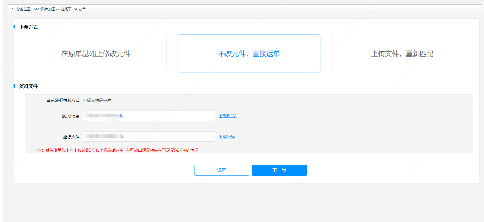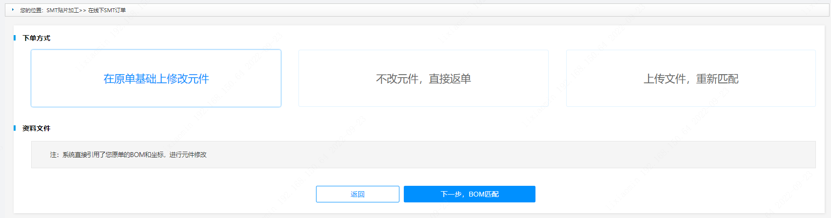 第四步:而后點擊【去下SMT】按鈕后會出現(xiàn)“下單方式”、“資料文件”頁面框,您可以選擇您需要的【下單方式】(“在原單基礎(chǔ)上修改元件”/“不改元件,直接返單”/“上傳文件,重新匹配”)后點擊下一步。
