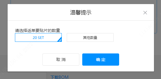 1.對于PCB數(shù)量在100和100片以上,系統(tǒng)會彈出“”返單要貼片的數(shù)量的頁面,您根據(jù)需要選好數(shù)量。