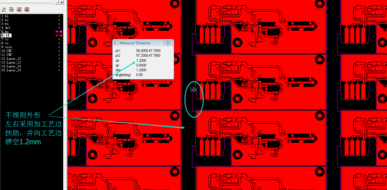 為了提高生產(chǎn)效率,采用連片拼板,但不規(guī)則外形常見錯(cuò)誤,像有些小角度,斜角外形拼版出現(xiàn)夾角,小于鑼刀尺寸它是無法鑼進(jìn)去。(槽刀最小尺寸1.0mm)http://www.thbsqx.cn/portal/server_guide_4110.html