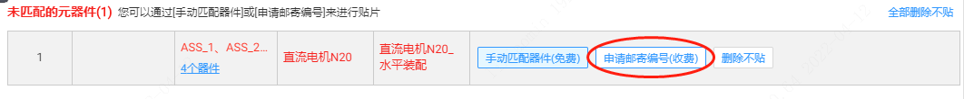第一步:在下SMT訂單選器件界面,未匹配到型號的器件,可以直接郵寄,可以點(diǎn)【申請郵寄編號(收費(fèi))】