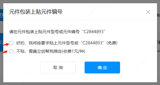 (1)點(diǎn)【請選擇是否已貼編號】會出現(xiàn)選擇彈窗,在元件包裝上勾選由客戶自己貼或嘉立創(chuàng)貼元件編號,并補(bǔ)充元器件的基本封裝信息。