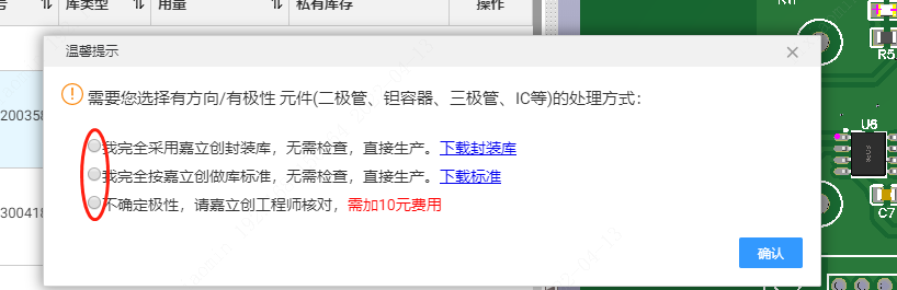 第五步:在彈出的【溫馨提示】窗口,勾選您需要的有方向、有極性 元件(二極管、鉭容器、三極管、IC等)的處理方式
