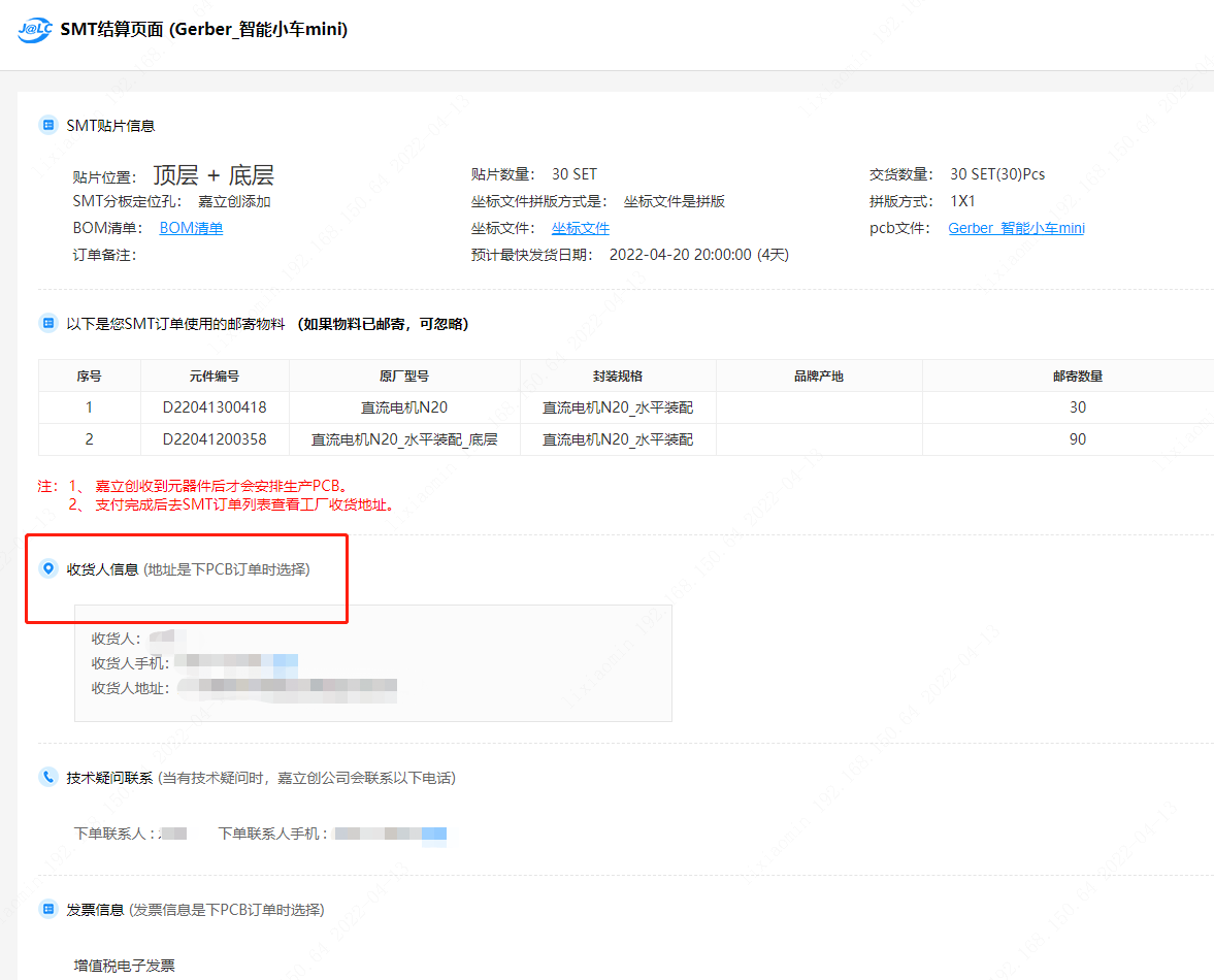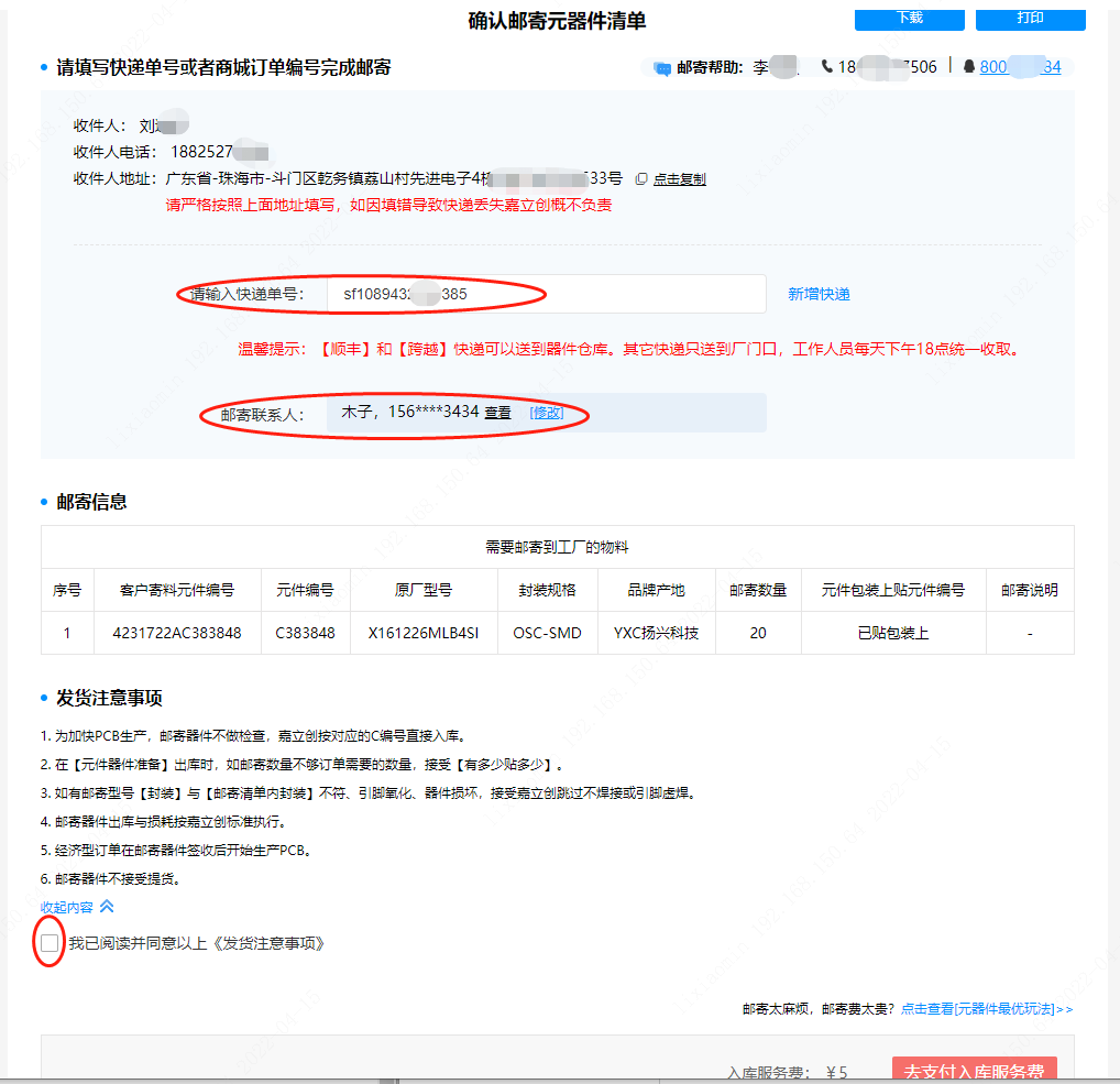第十步:點(diǎn)完后會彈出確認(rèn)郵寄元器件清單頁面,這個(gè)頁面需要您下好快遞(記得在每個(gè)需要郵寄的器件包裝袋上寫好器件編號),下好后回來填好【快遞單號】、【郵寄聯(lián)系人】,閱讀并勾選發(fā)貨注意事項(xiàng)。
