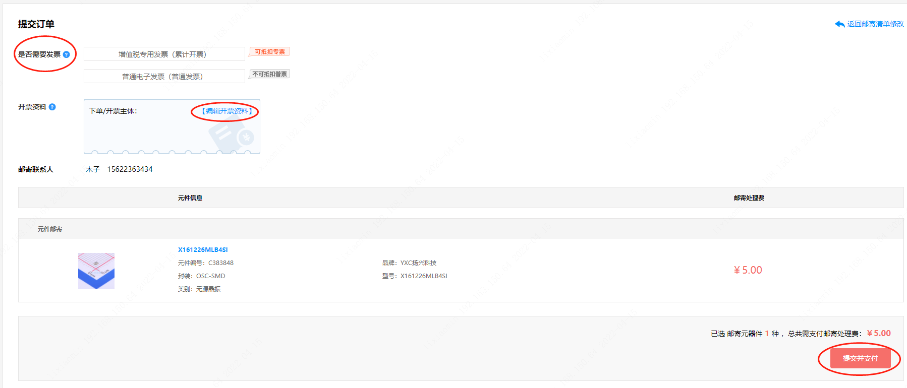 第十一步:之后點(diǎn)擊【去支付入庫服務(wù)費(fèi)】,會彈出提交訂單頁面,選擇【是否需要發(fā)票】,并編輯好【開票資料】。完成后點(diǎn)擊【提交并支付】。