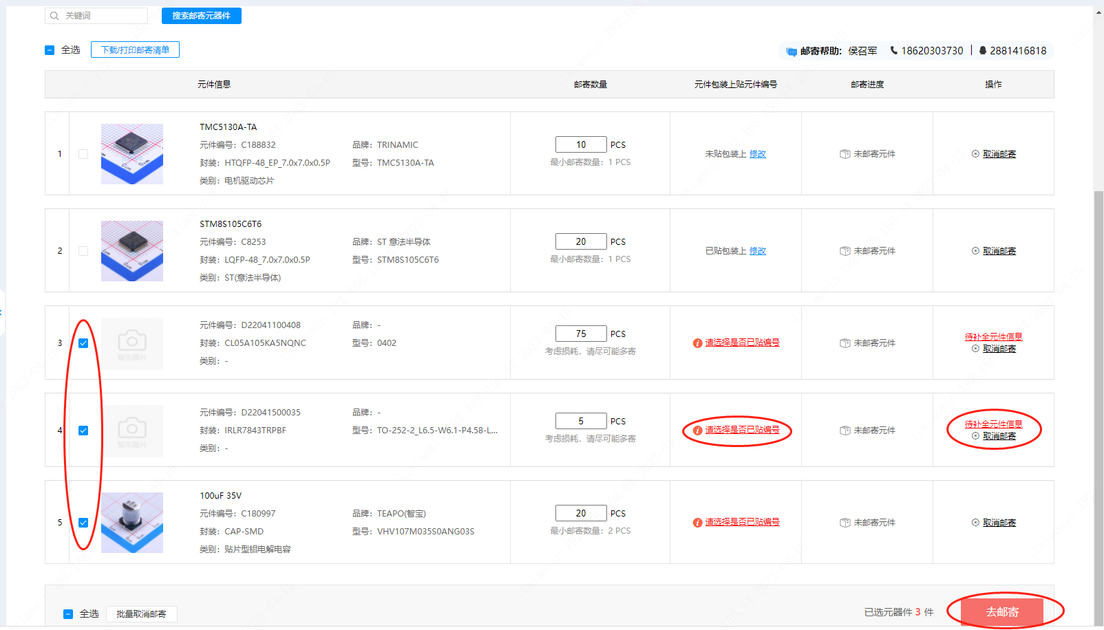(3)在郵寄信息確認(rèn)完后,客戶可以勾選需要郵寄的器件后,點(diǎn)【去郵寄】按鈕。