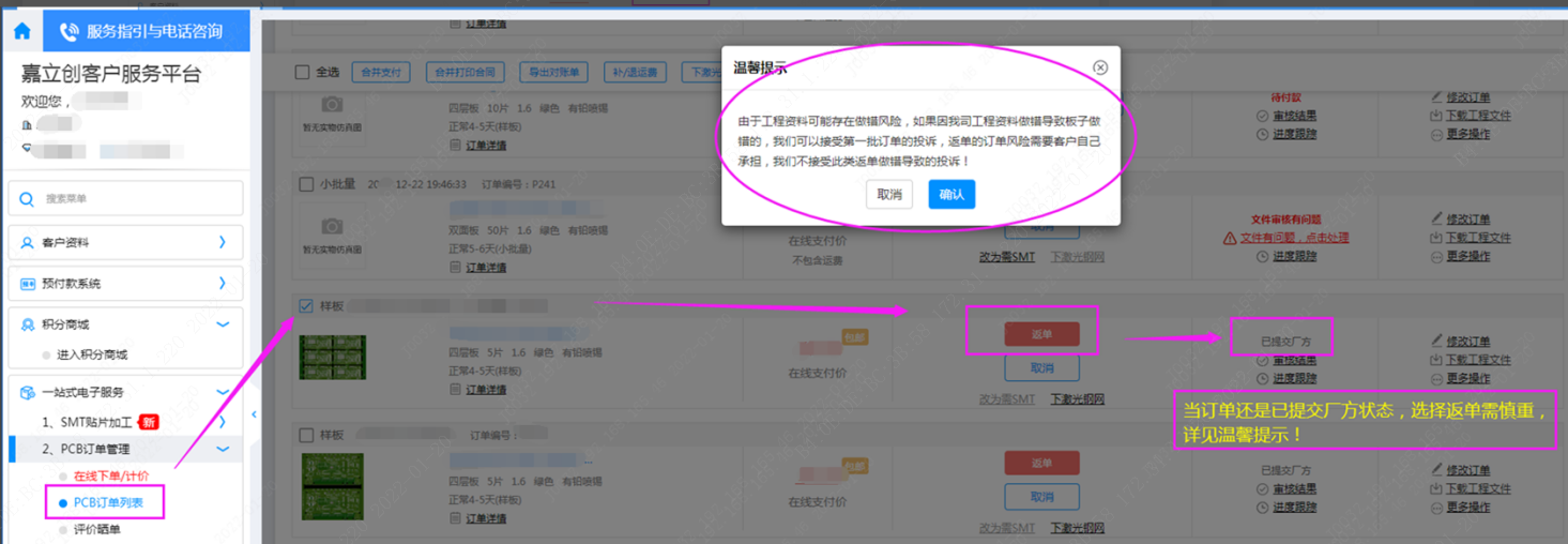 個(gè)別情況樣板還沒(méi)發(fā)貨就返單生產(chǎn)的,需注意一下溫馨提示里的內(nèi)容: