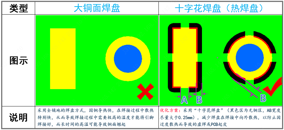 我們知道銅的導(dǎo)熱率很高(導(dǎo)熱率大概380W),因此不管是手工焊接還是回流焊,在焊接時(shí)銅面都會(huì)迅速導(dǎo)熱,而致使烙鐵等溫度流失,對(duì)焊接產(chǎn)生影響,因此設(shè)計(jì)上盡量采用"十字花焊盤(pán)"減少熱量散發(fā),方便焊接。