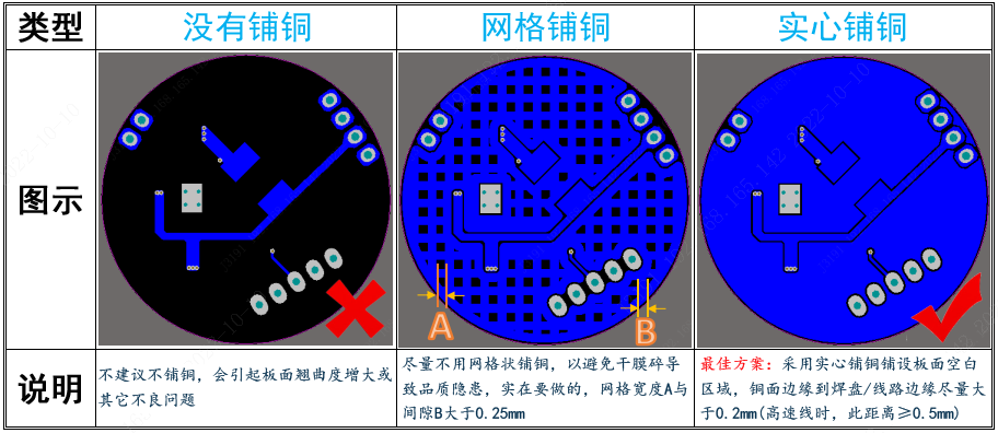 設(shè)計(jì)建議:板內(nèi)空曠區(qū)盡量覆上銅皮,如有高速信號(hào)線,離信號(hào)線需有0.5mm以上的距離