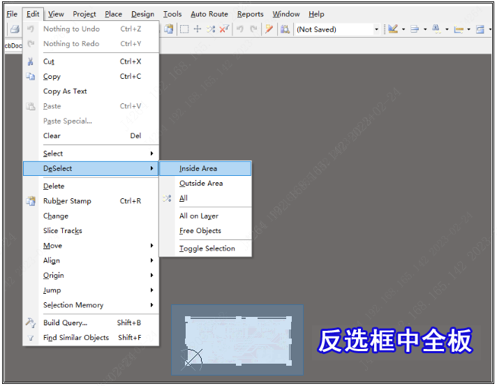3)Edit-DeSelect-Inside Area拉個大框把板反選(即把原來全選中的板子圖案處,通過反選把這些地方取消選擇)
