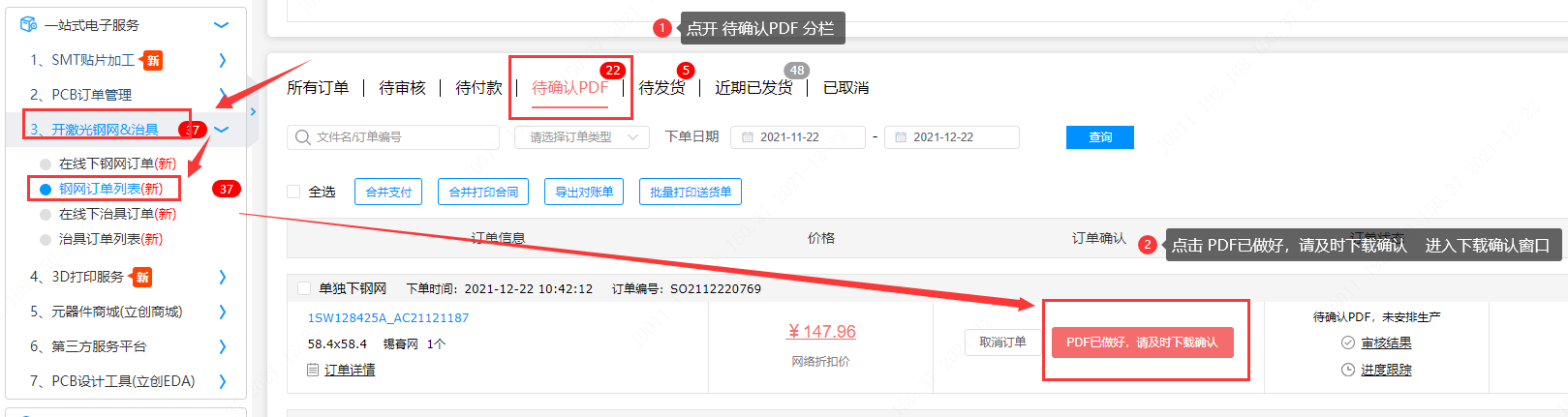 確認(rèn)PDF文檔需先付款,付款后等1-2小時(shí)工程出文件,然后在鋼網(wǎng)訂單列表中點(diǎn)擊【PDF已做好,請及時(shí)下載確認(rèn)】。根據(jù)實(shí)際情況點(diǎn)擊后面的操作按鈕。如下圖所示: