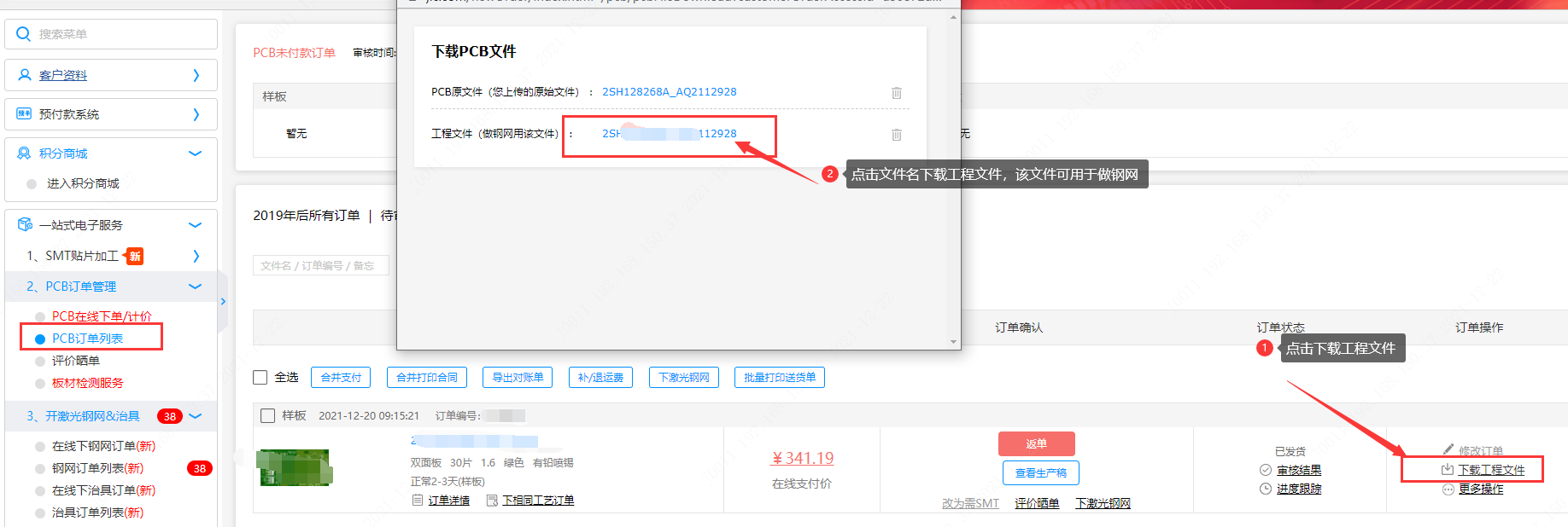 您好,如圖操作,在下單系統(tǒng)【PCB訂單管理】-【PCB訂單列表】-【點(diǎn)擊下載工程文件】即可。