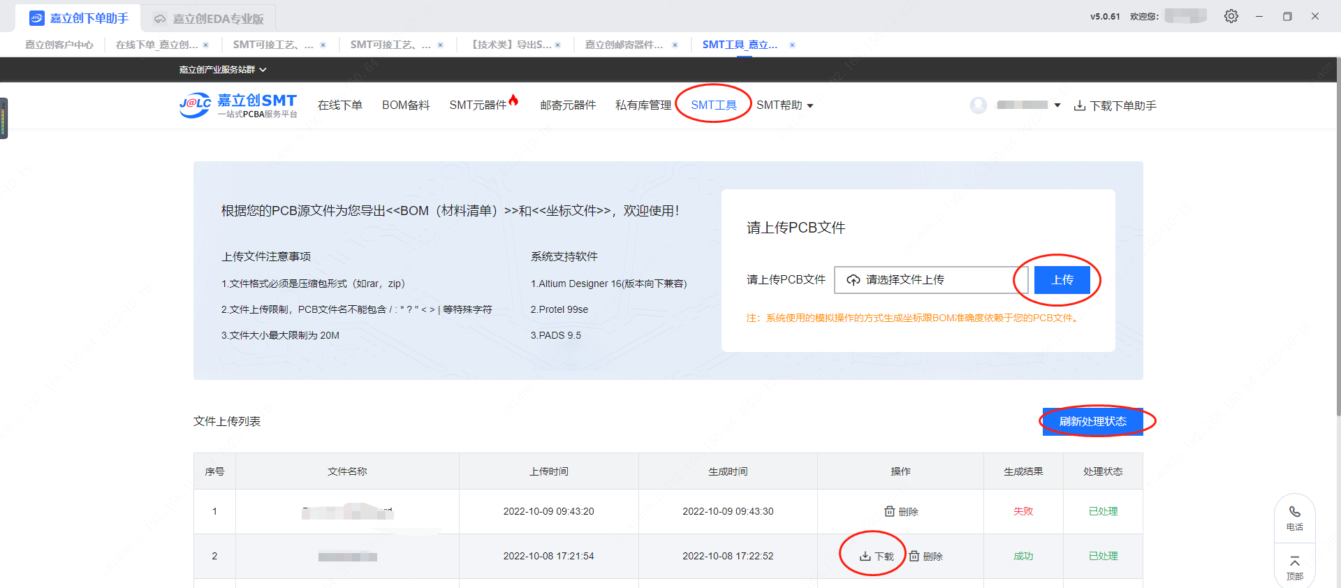1.在【SMT訂單】--【SMT工具】中,點擊選擇文件,上傳PCB文件(文件名不要帶pcb字樣,否則上傳不