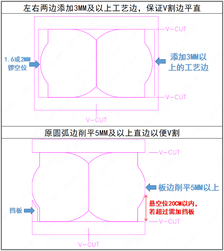 在實(shí)際生產(chǎn)中,V割加工板子類似在軌道中行動(dòng)的火車,因此需要兩邊是直邊才能V割的,相關(guān)的拼板方式請(qǐng)參考V割拼板