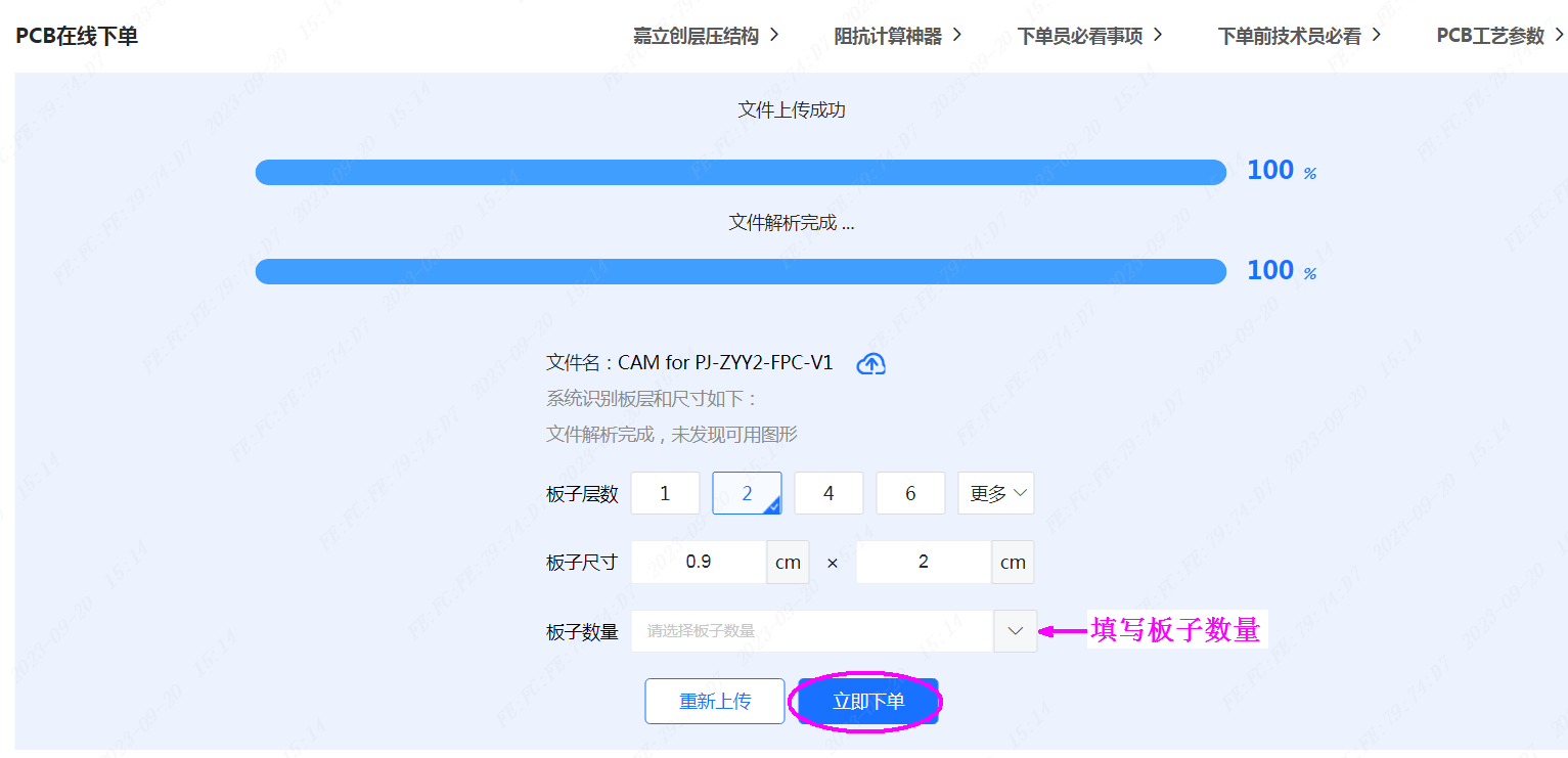 3.上傳文件后,等待文件解析,確認板層,板尺寸填寫板子數(shù)量,再點立即下單(個別資料解析失敗,可以手動填板層,板尺寸繼續(xù)下單)